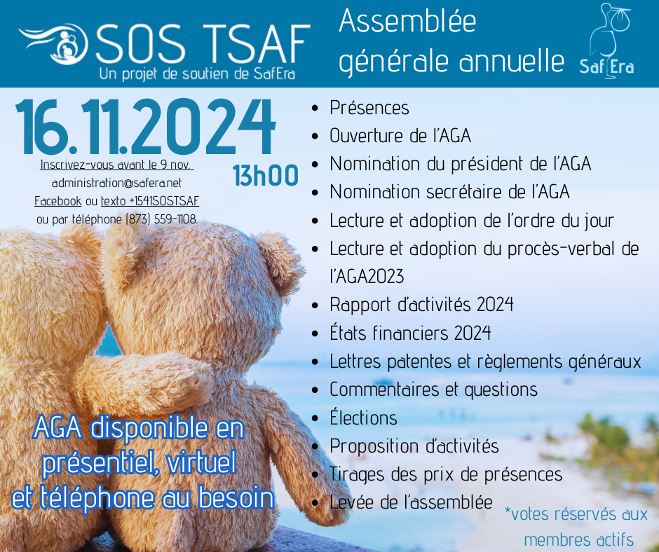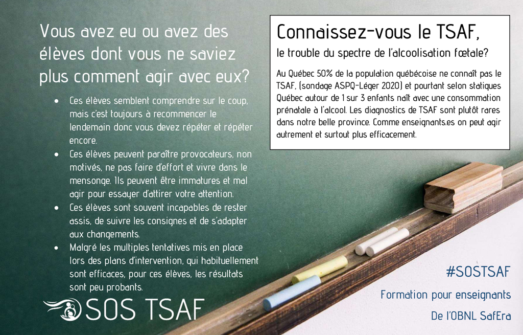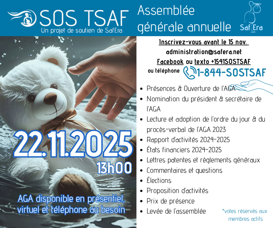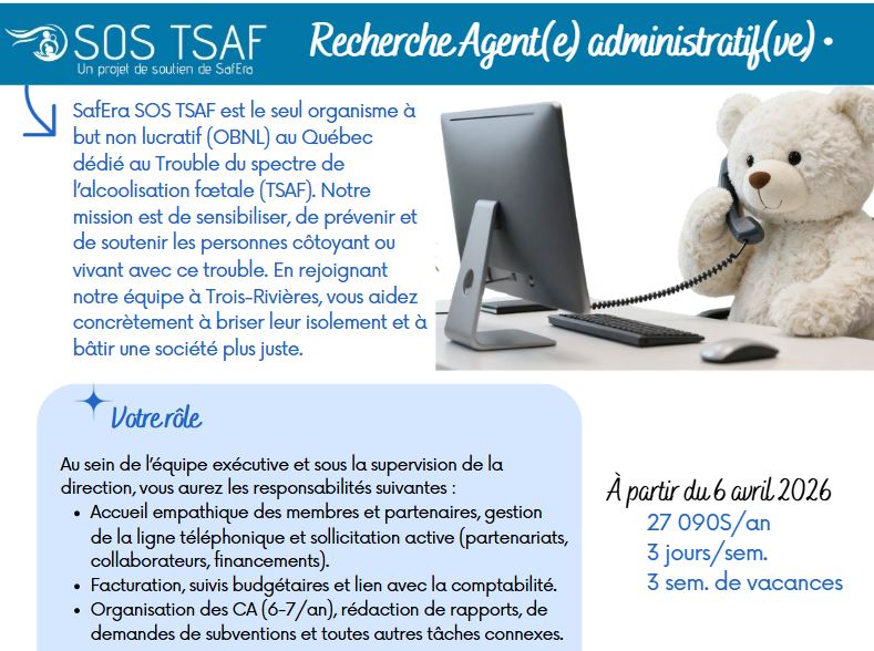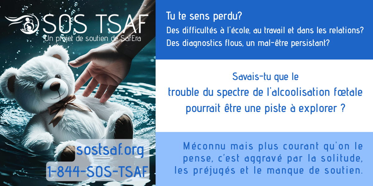 Soutenir SafEra SOS TSAF, c’est poser un geste essentiel pour une réalité encore trop souvent invisible.Le TSAF est un handicap neurologique permanent qui affecte le fonctionnement quotidien, les apprentissages, la santé mentale et l’intégration sociale. Sans compréhension adéquate et sans soutien adapté, les personnes touchées sont souvent confrontées à l’échec scolaire, à l’isolement, à la stigmatisation et à des parcours de vie marqués par des ruptures de services. Les proches aidants, quant à eux, portent une charge immense, souvent dans l’épuisement et le sentiment d’être seuls face à un système mal outillé. Pour en savoir plus, contactez-nous au 1 844 SOS TSAF
